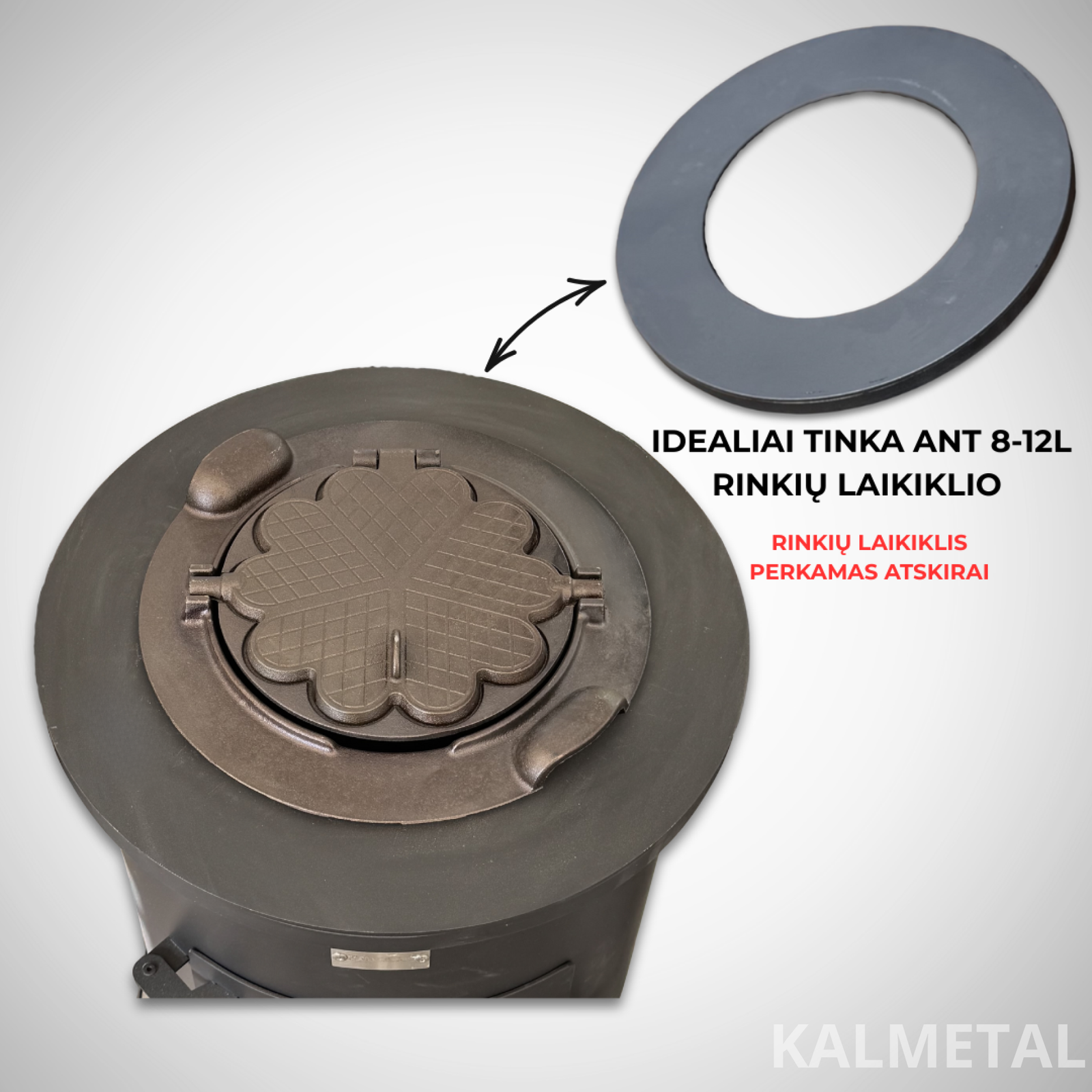 - Idealiai tinka naudoti su 8-12L rinkių laikikliu (perkamas atskirai) - https://kalmetal.lt/rinkiu-laikiklis-kazano-krosnelei-144