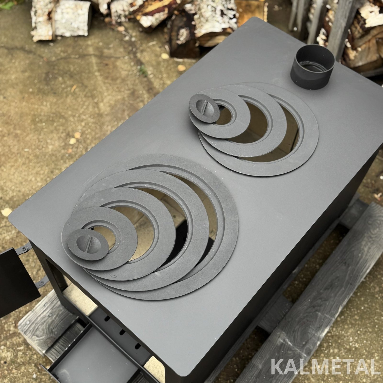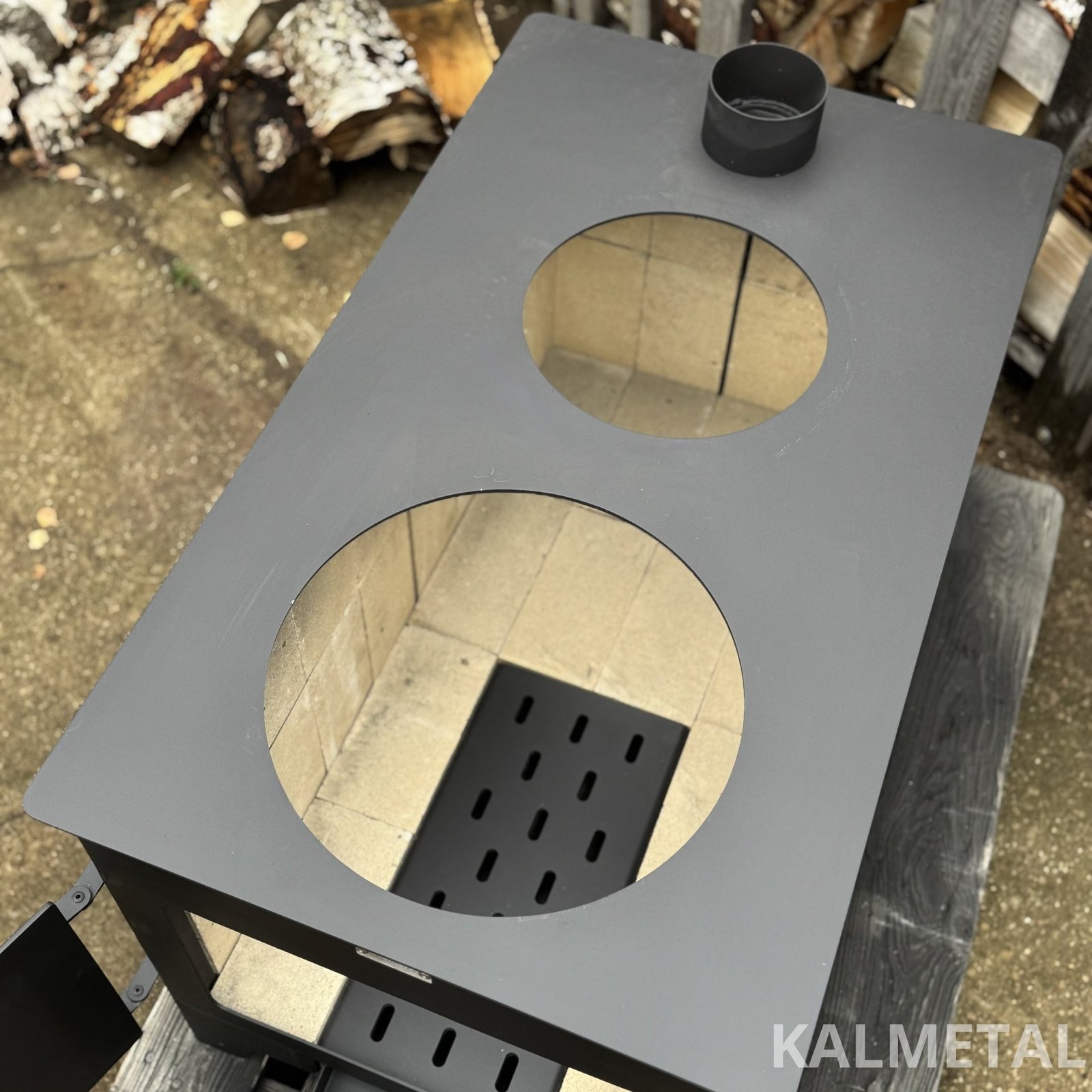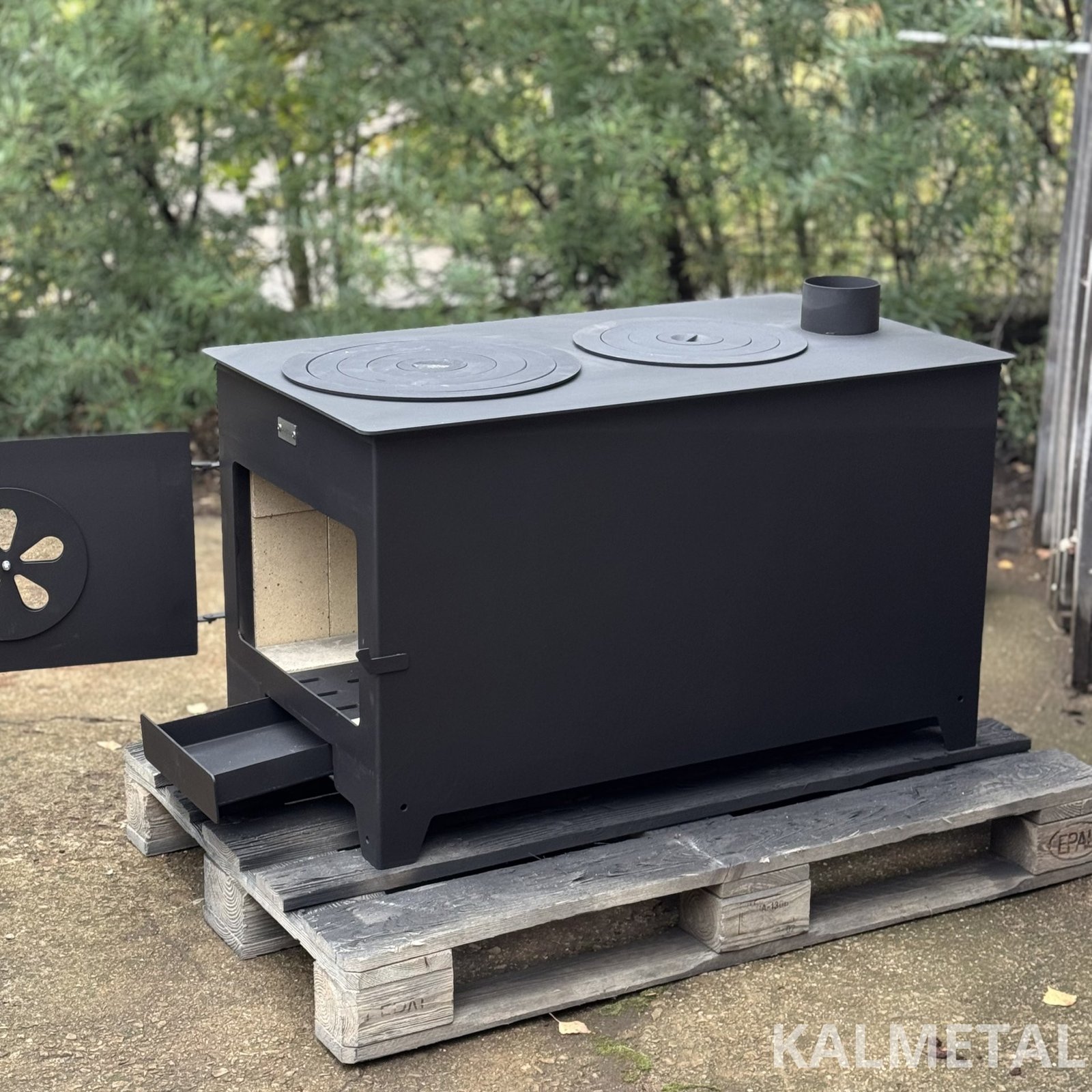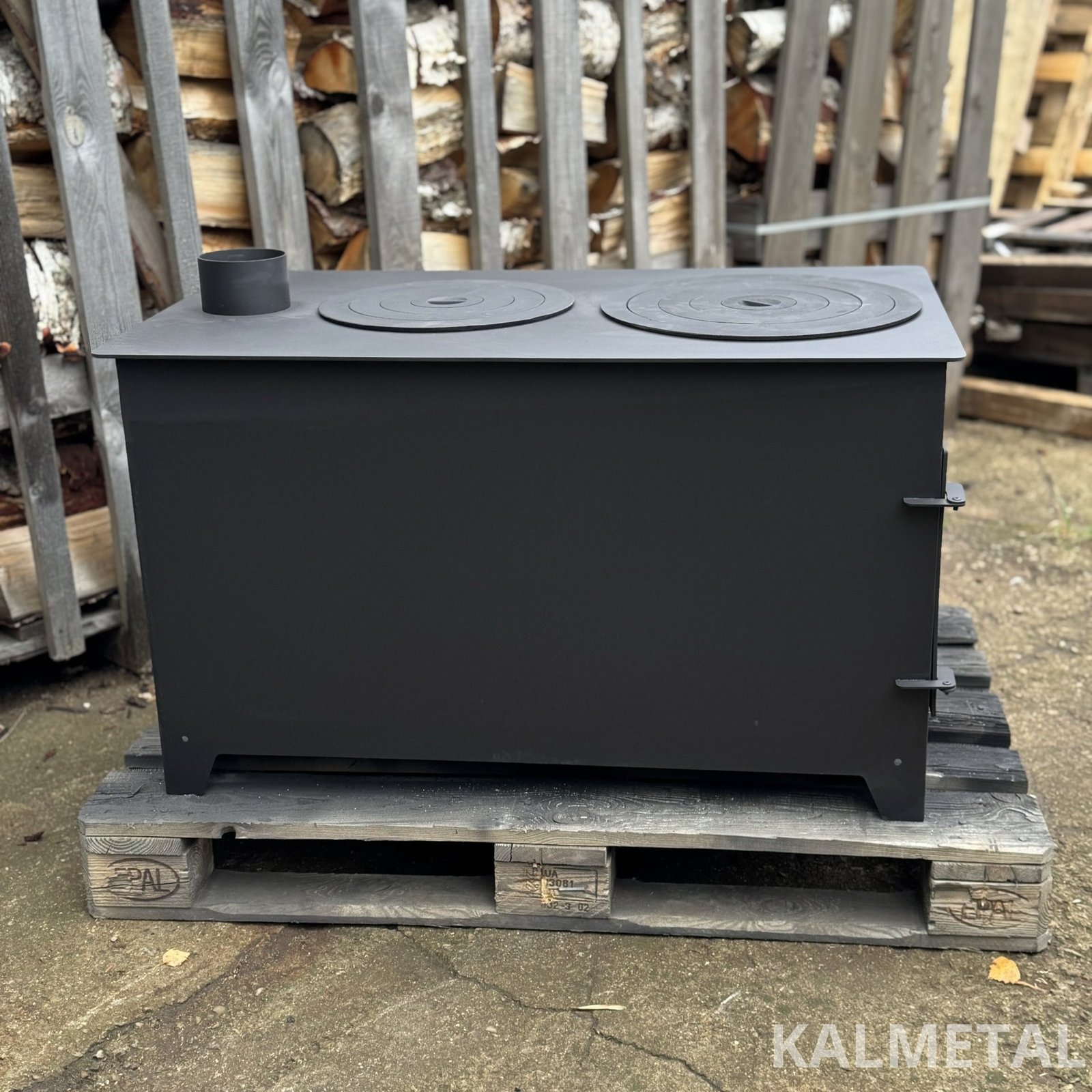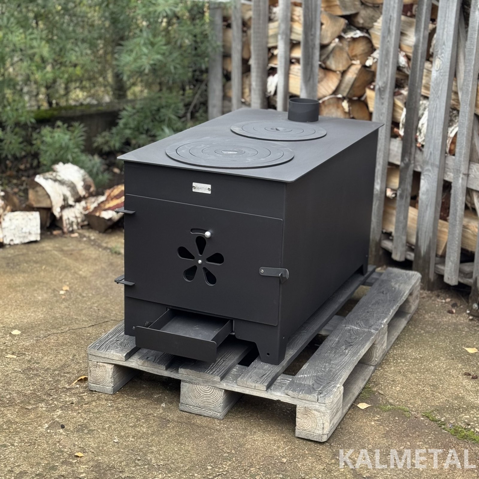 Two-ring, minimalist design, highly efficient solid fuel stove with fireclay, commonly known as a "Buržuika" – perfect for cooking as well as heating your modular cabin, garage, forest hut, terrace, or outdoor kitchen.