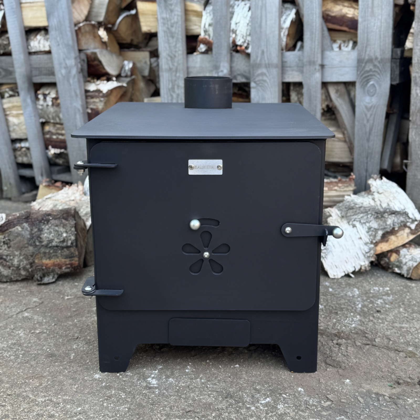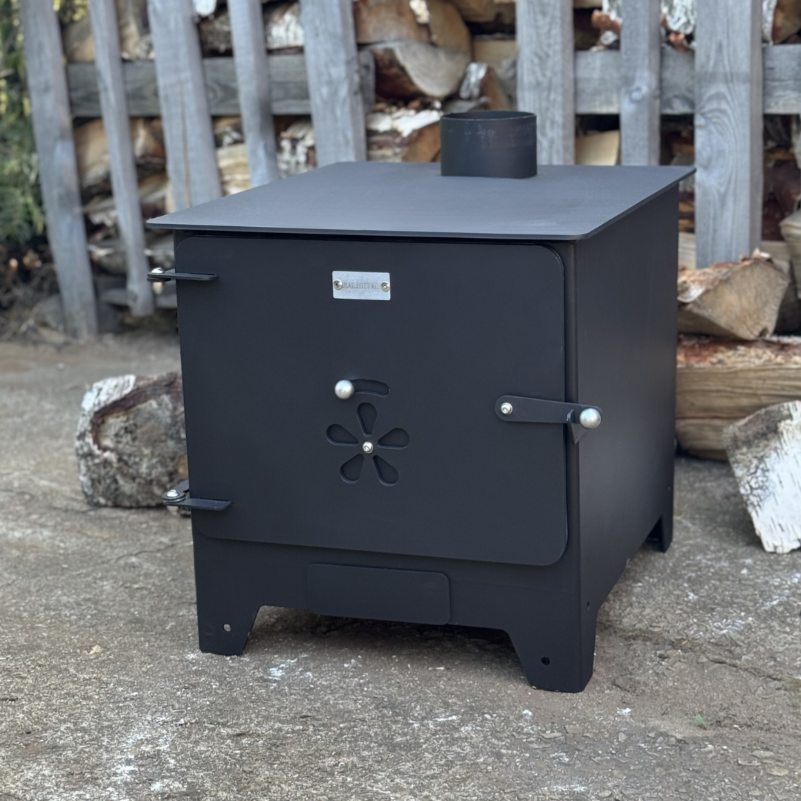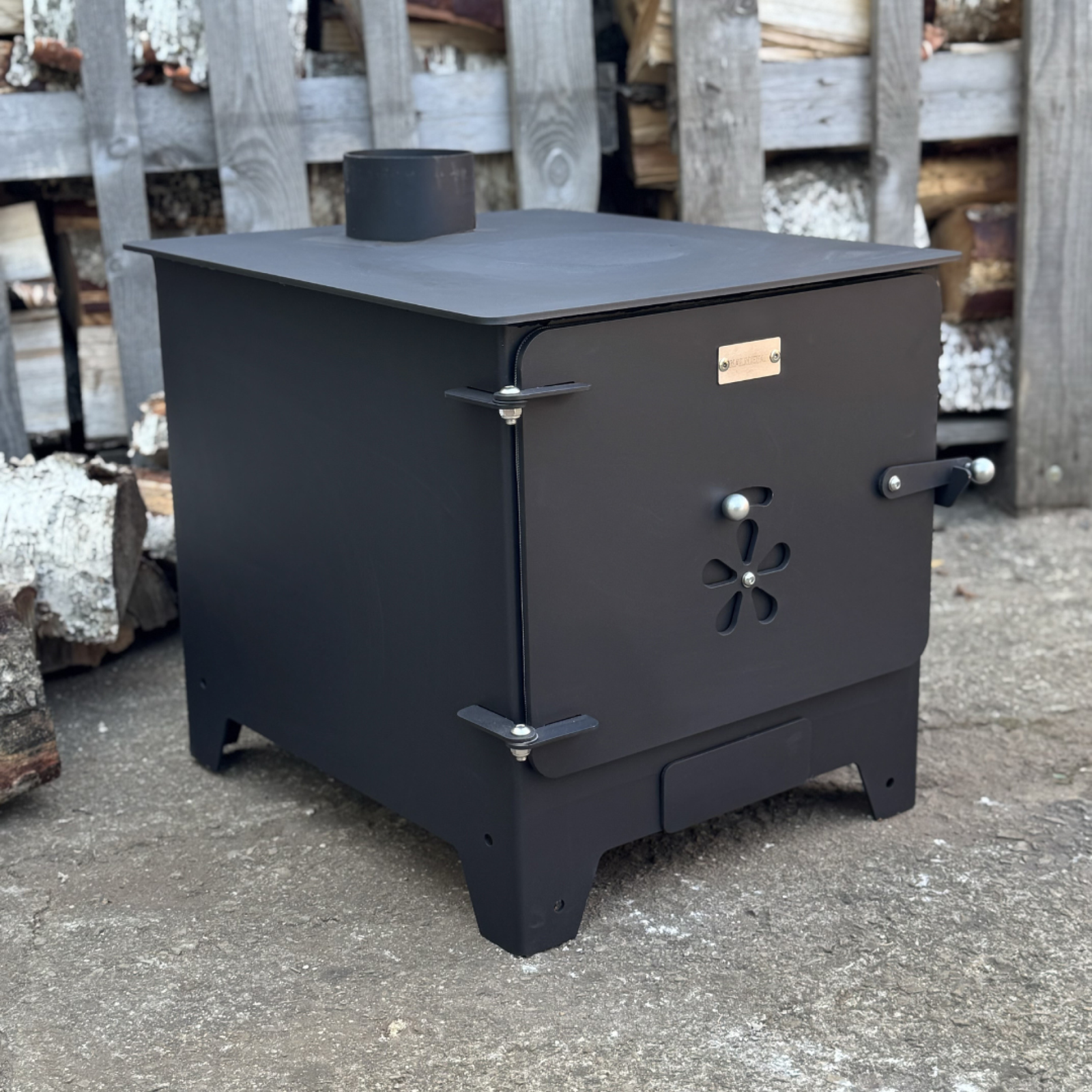 Minimalist design and efficiently operating solid fuel stove – small heater, "buržuika" – ideal for your modular cabin, garage, terrace, or outdoor kitchen.