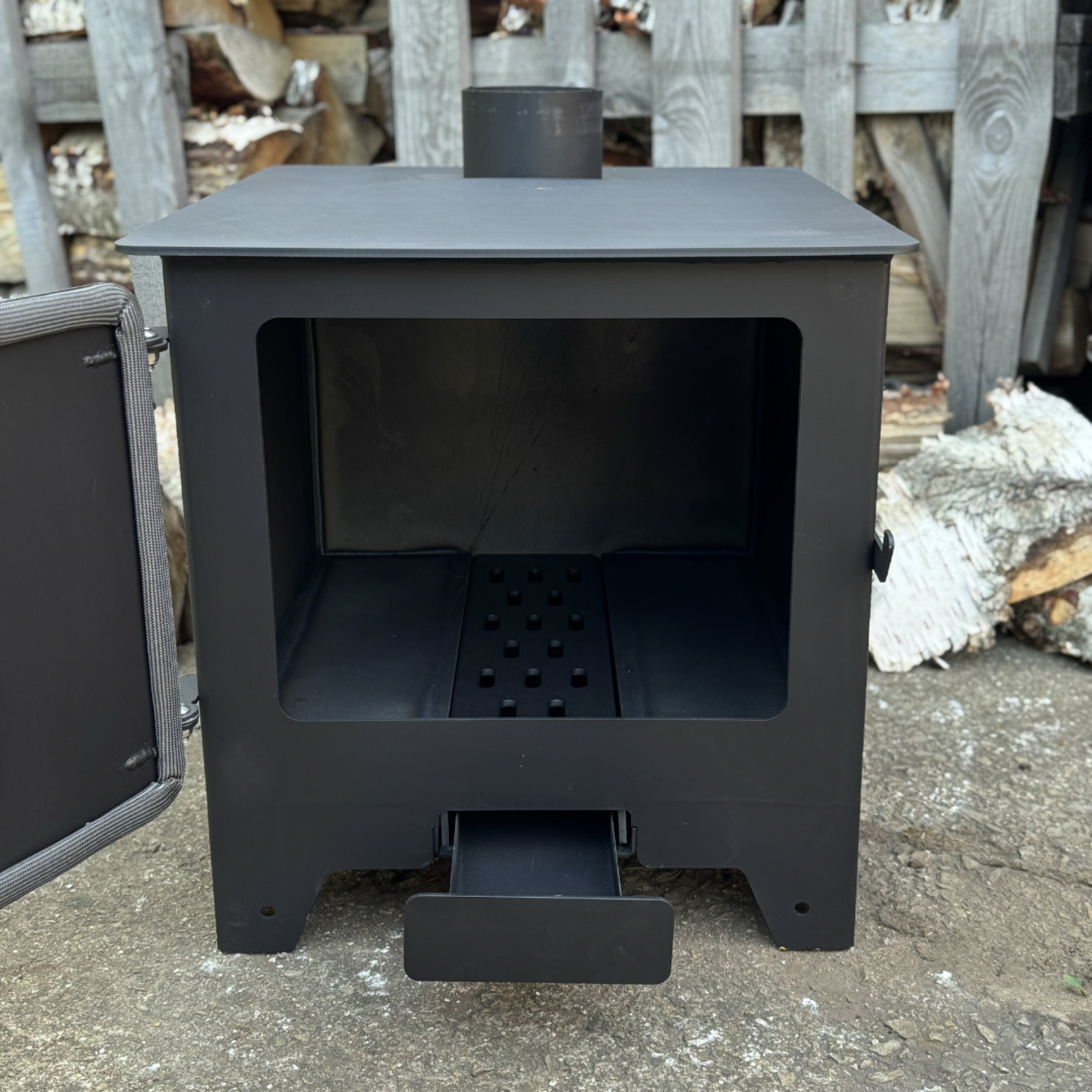 Comes with an ash drawer, flame deflector, and a gasket on the door!