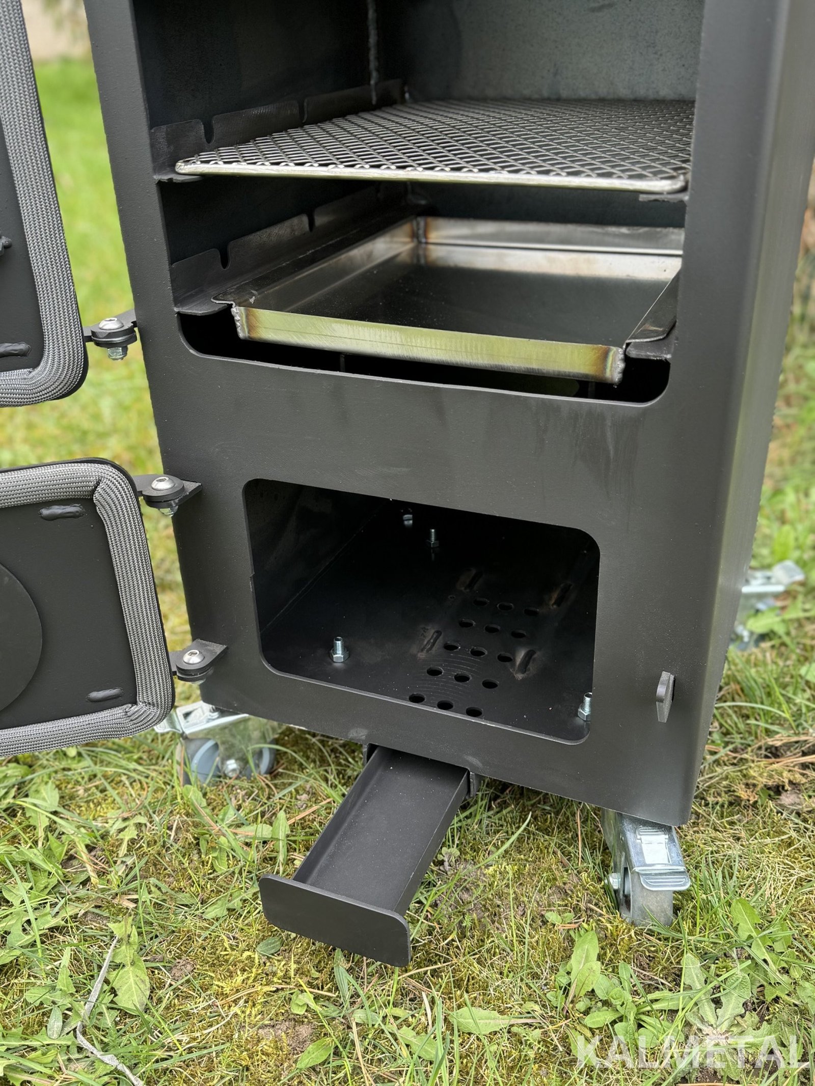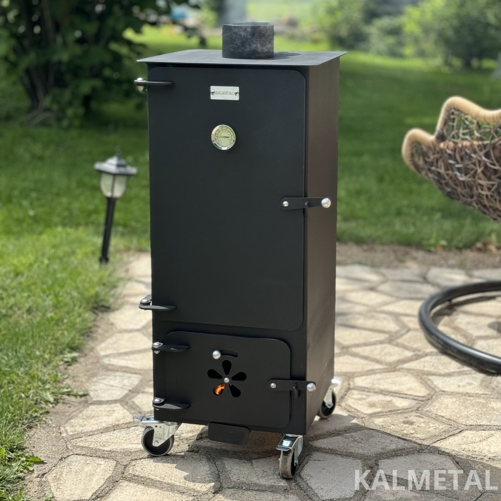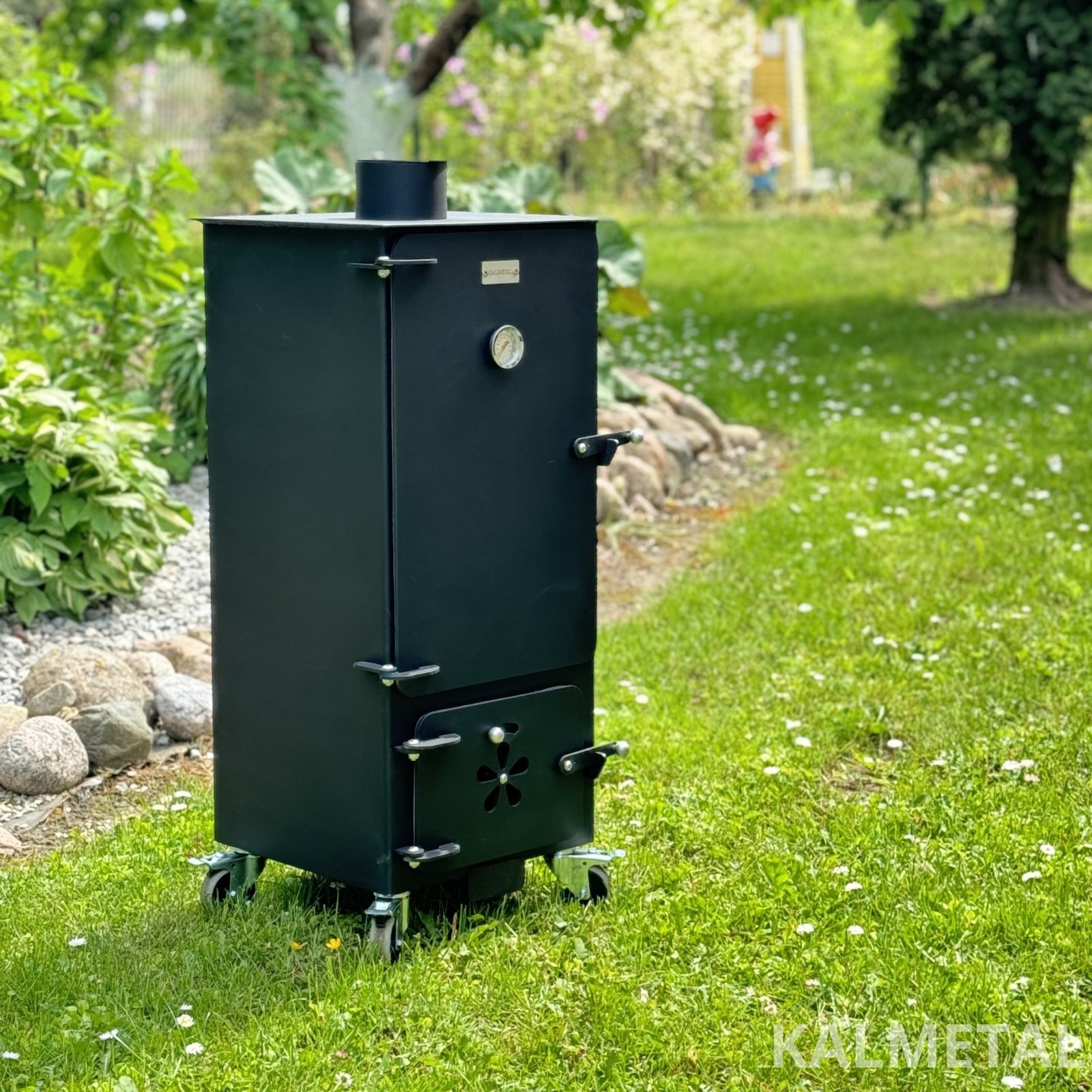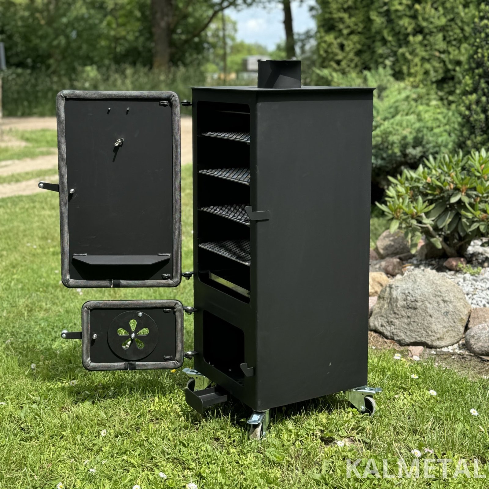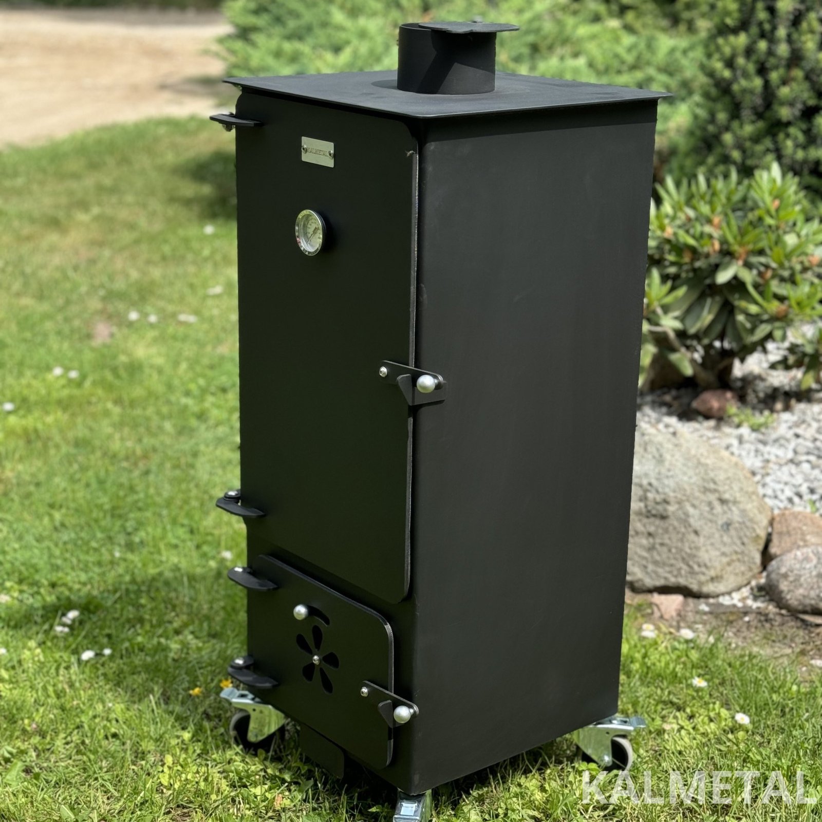 Minimalistinio dizaino ir efektyviai veikianti kompaktiška 70L talpos karšto - šalto rūkymo rūkykla su ratukais.