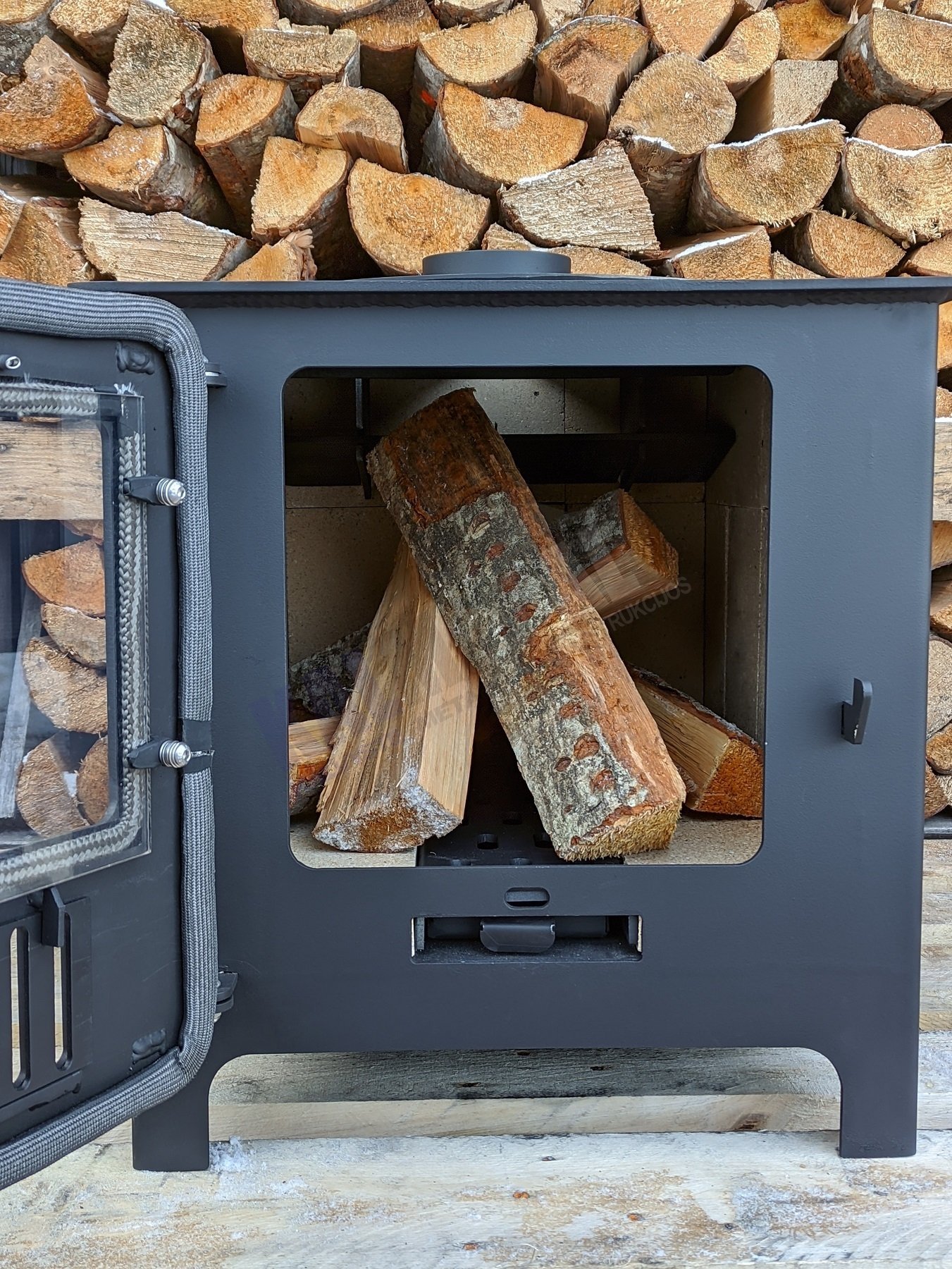 Minimalistinio dizaino ir efektyviai veikianti kieto kuro krosnelė - židinys su stiklu durelėse ir su šamotinėmis plytomis viduje.