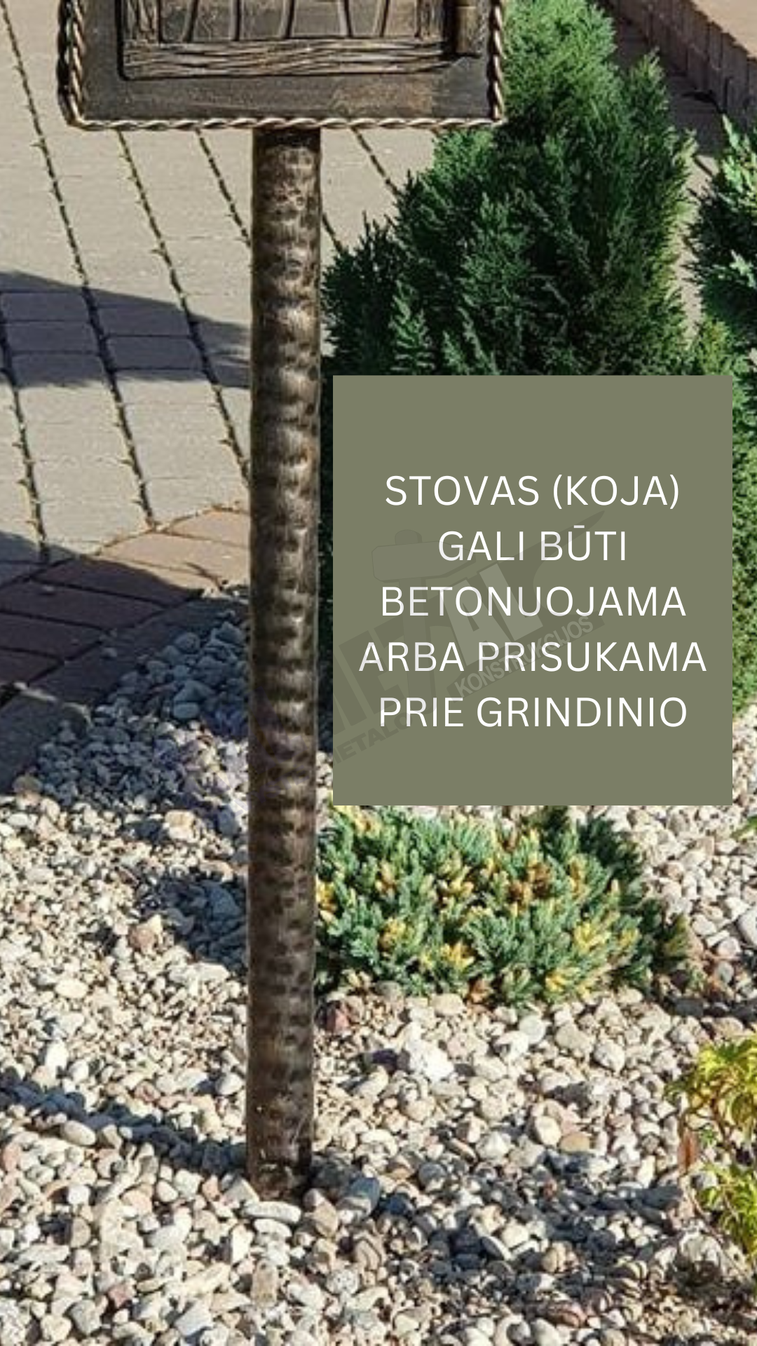Pašto dėžutė gali būti montuojama ant sienos, ant tvoros ar kito pagrindo. Taip pat už papildomą kainą (+40 Eur), ji gali būti pastatoma ant kojos (stovo), kurią prikomplektuosime.