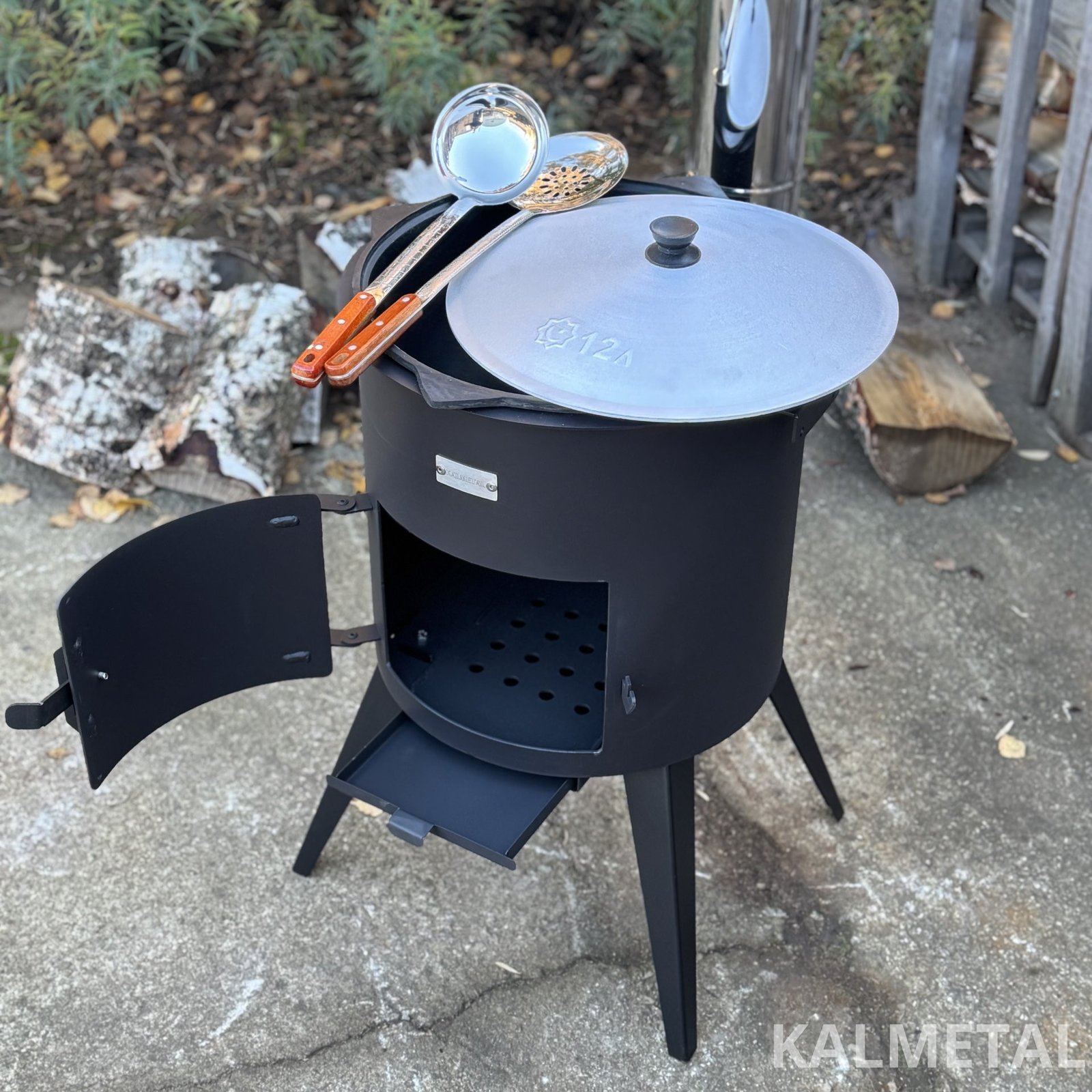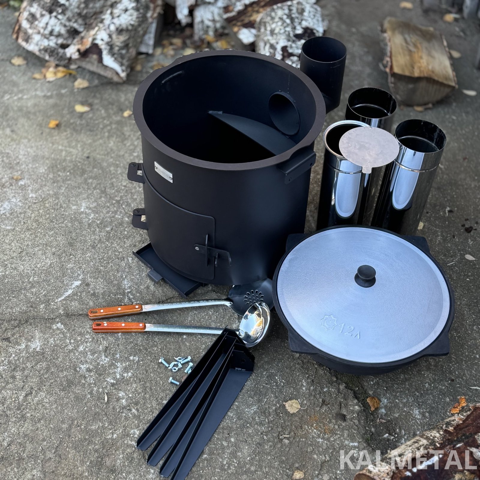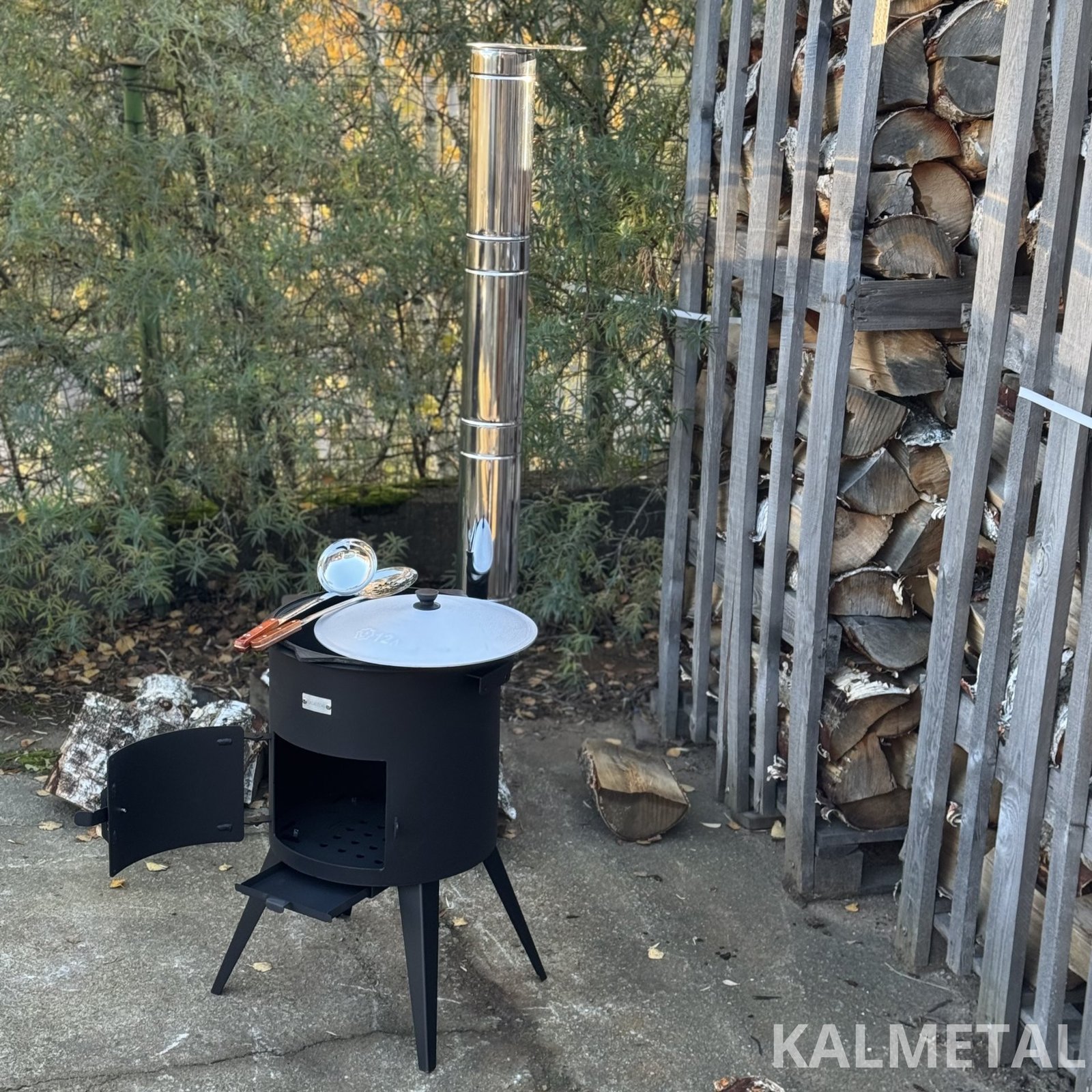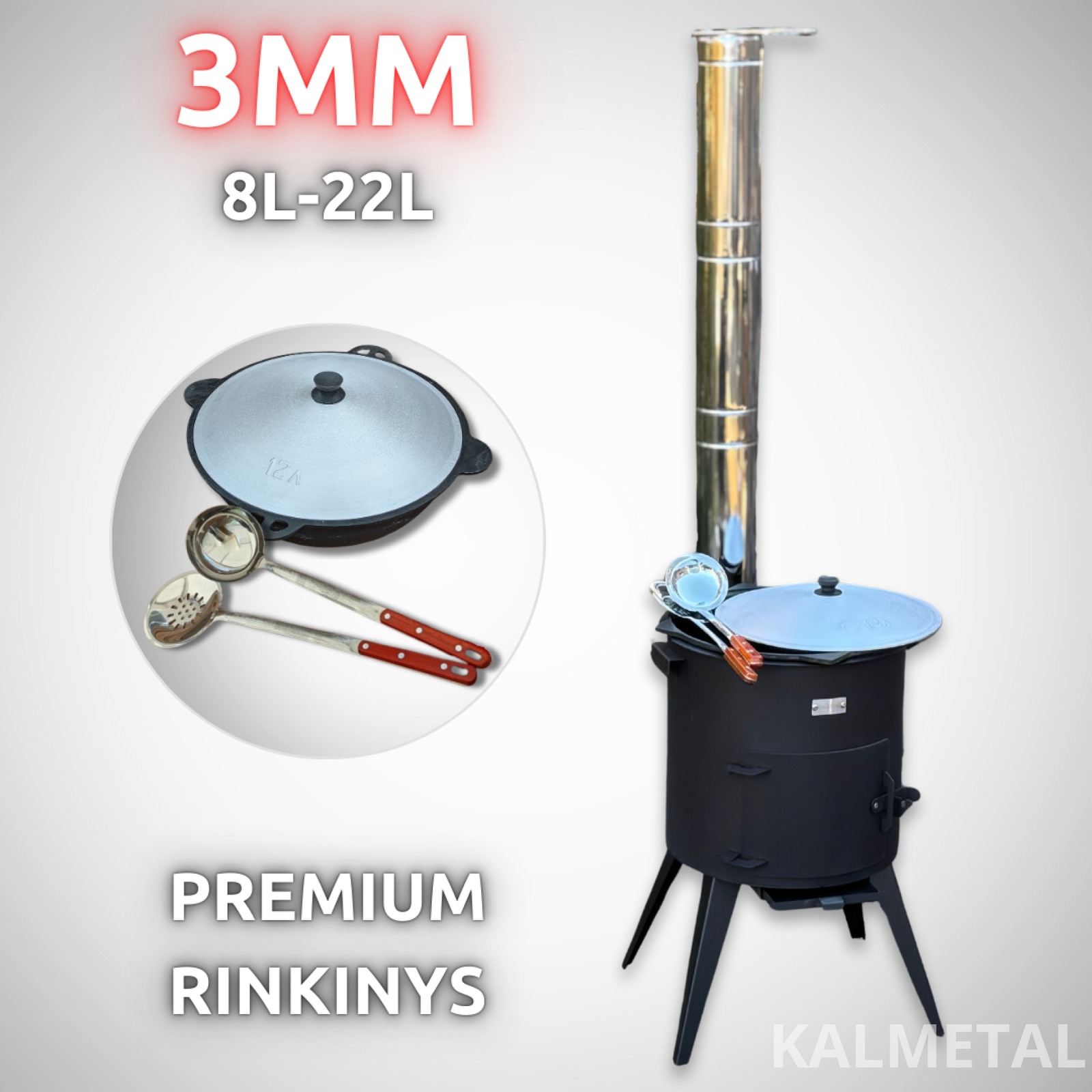 Pirkdami šį rinkinį, gaunate - PREMIUM 3MM storio KROSNELĖ SU KAMINU + UZBEKIŠKAS KAZANAS PLOKŠČIA APAČIA IŠORĖJE + SAMTIS + KIAURASAMTIS
