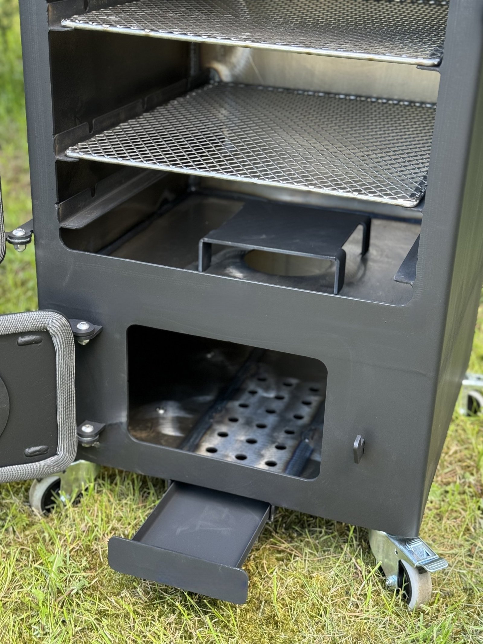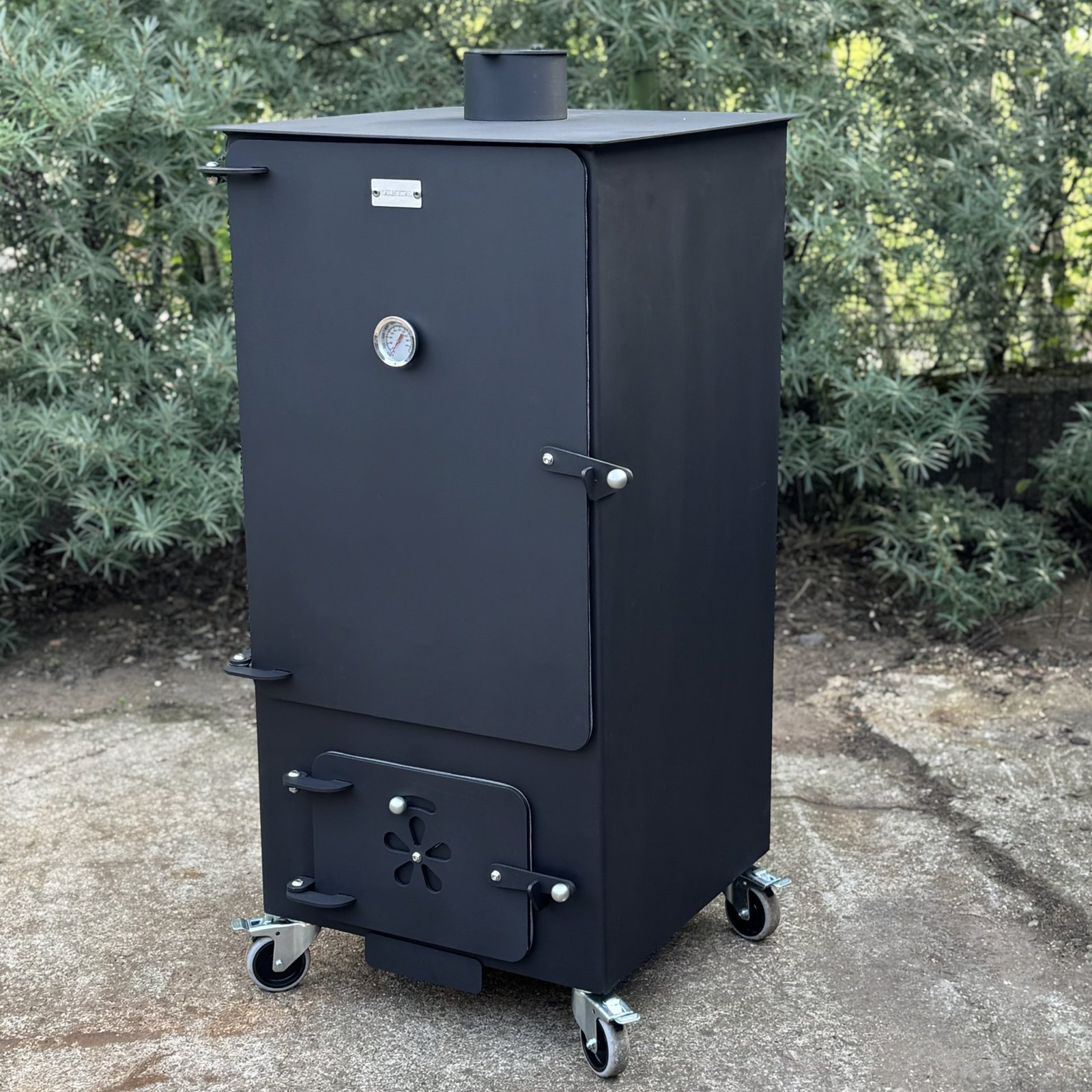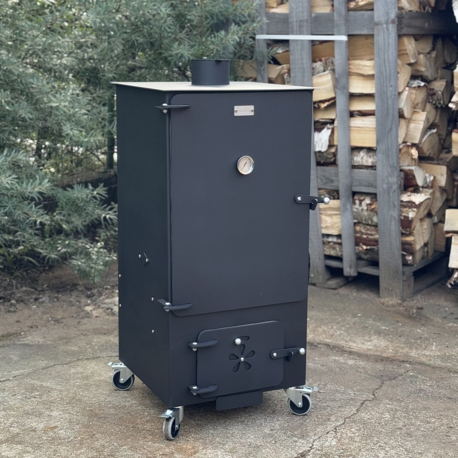 Minimalistinio dizaino ir efektyviai veikianti 135L talpos karšto - šalto rūkymo rūkykla su ratukais