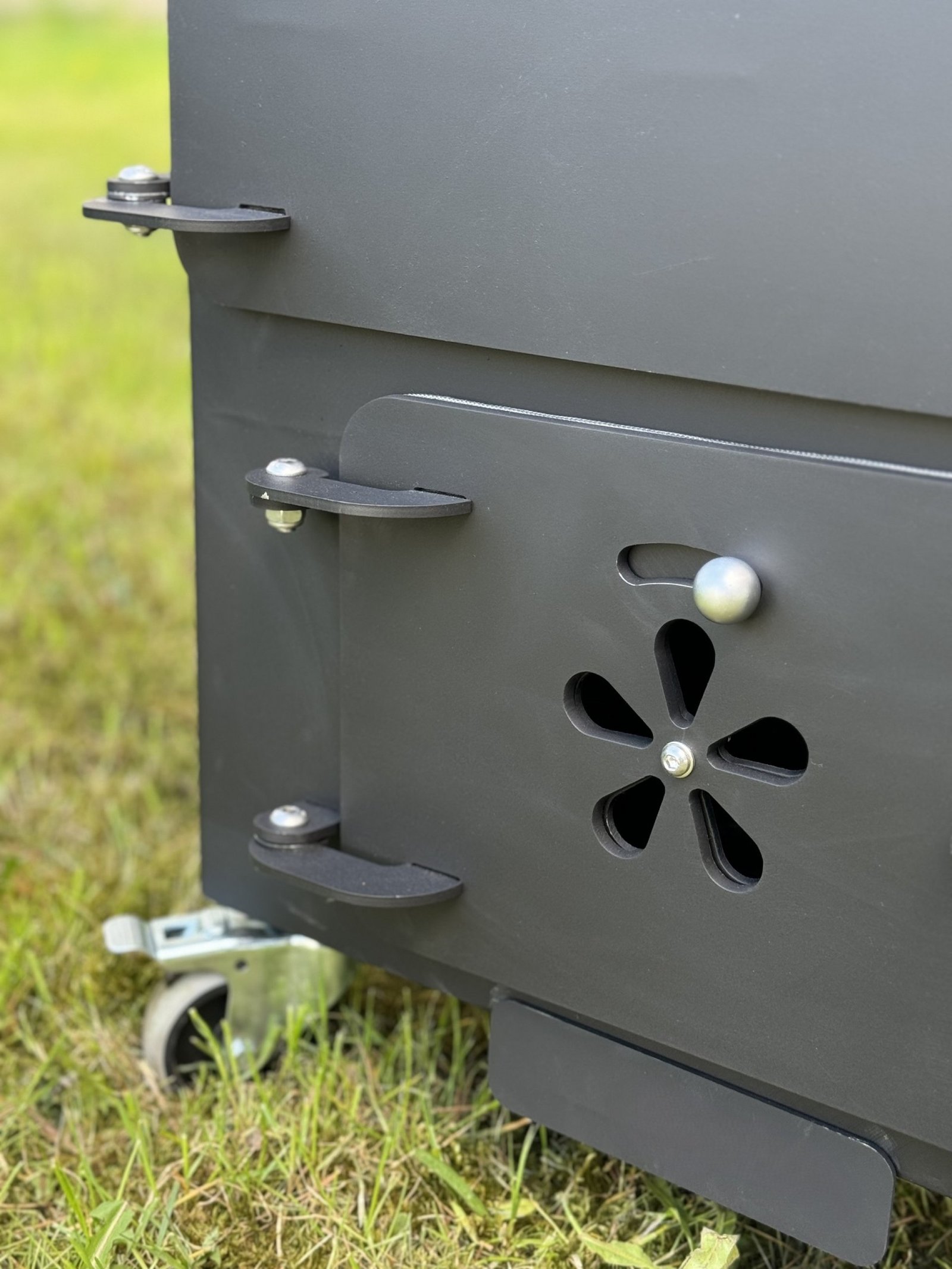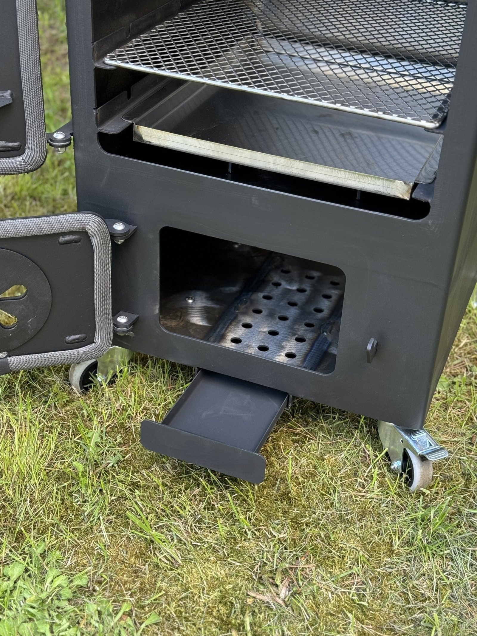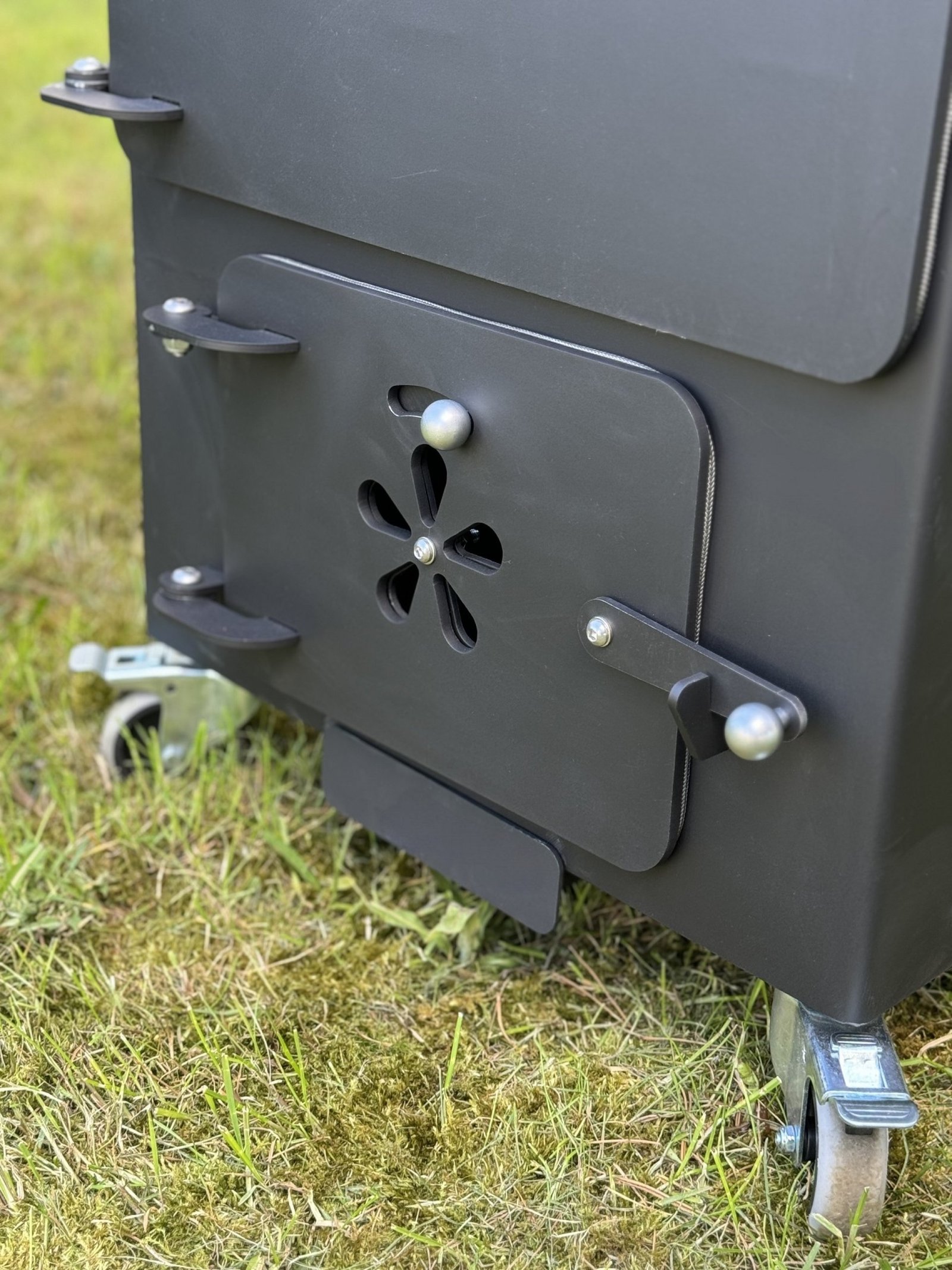 Minimalistinio dizaino ir efektyviai veikianti 135L talpos karšto - šalto rūkymo rūkykla su ratukais