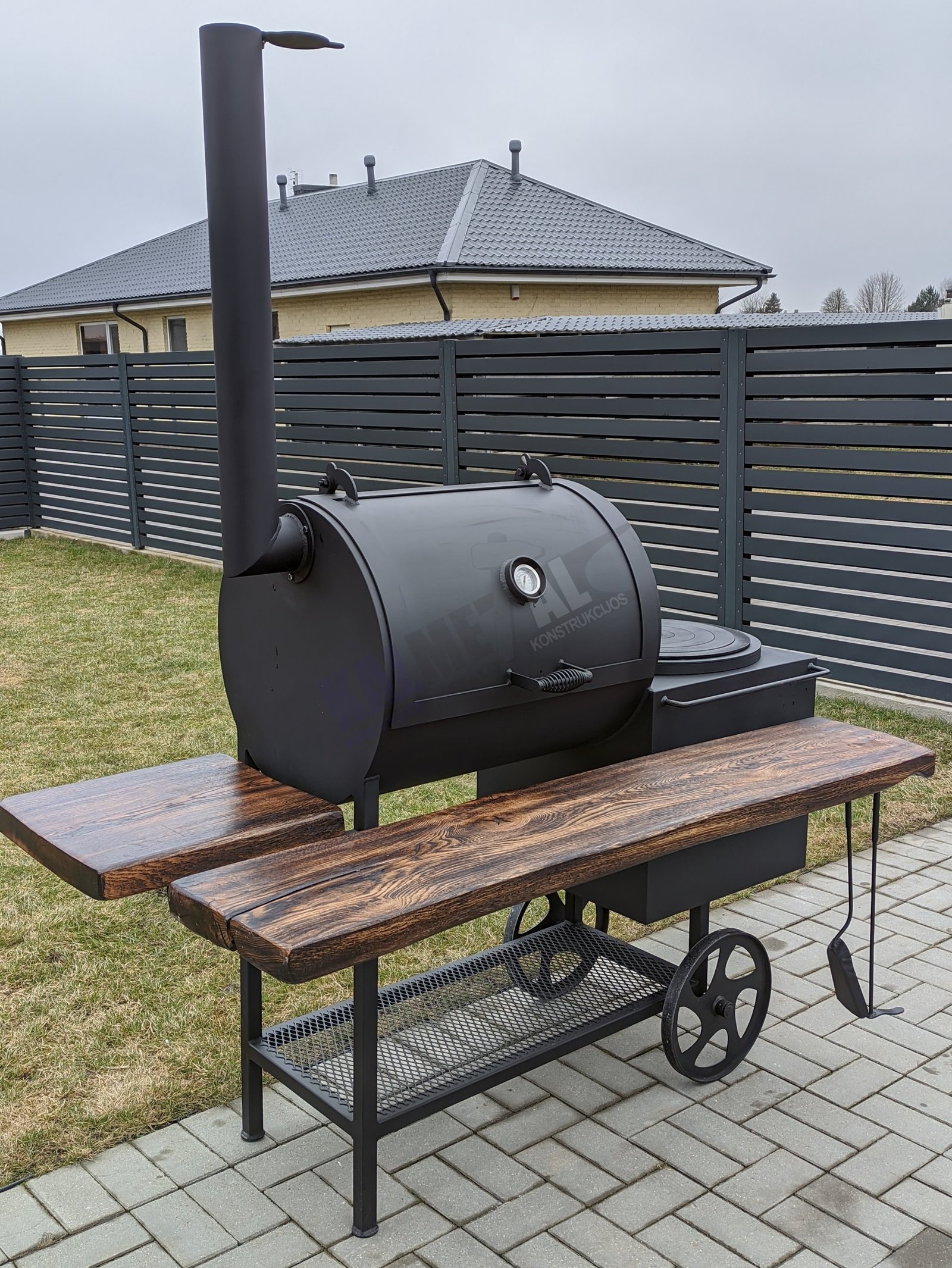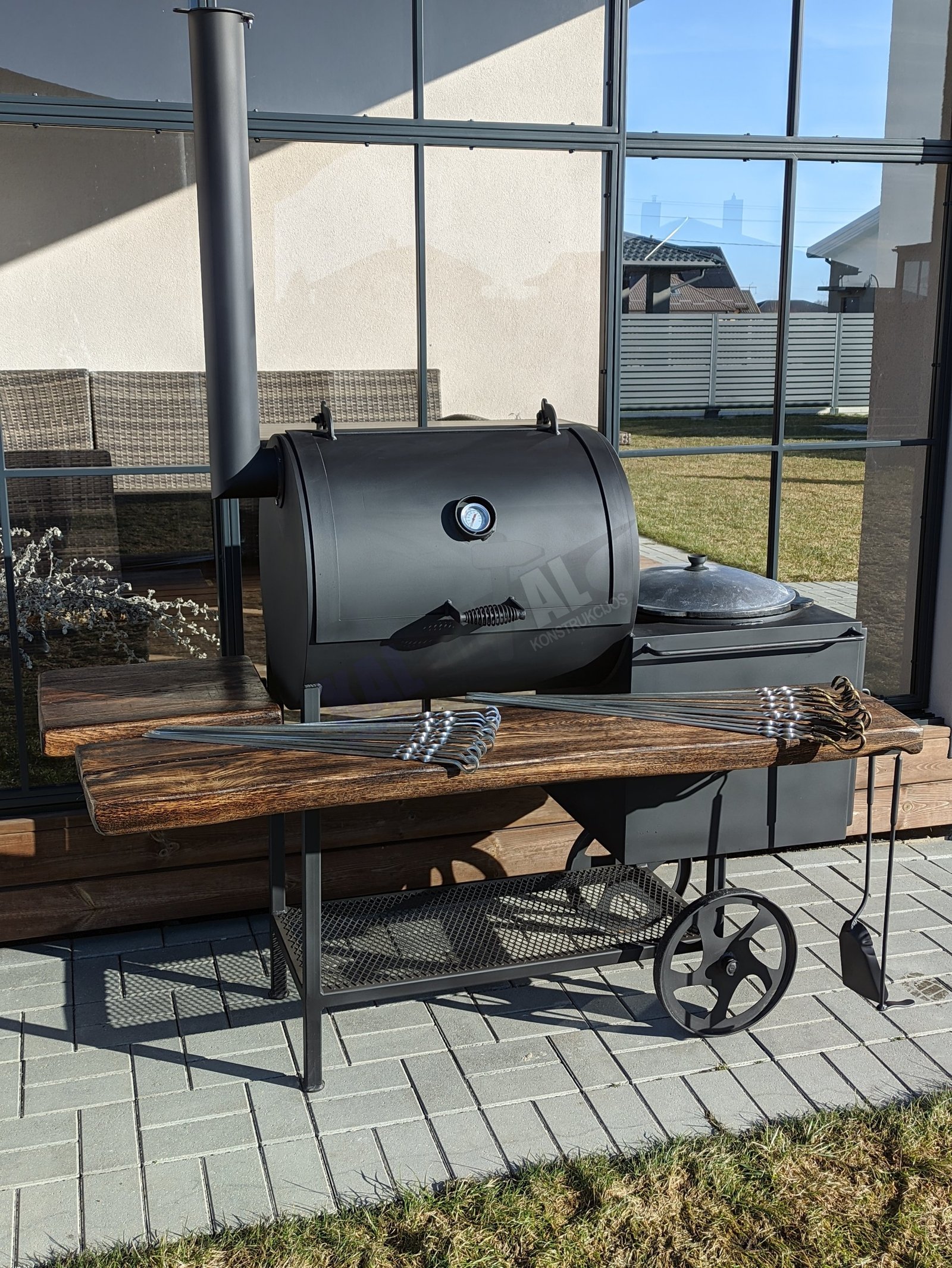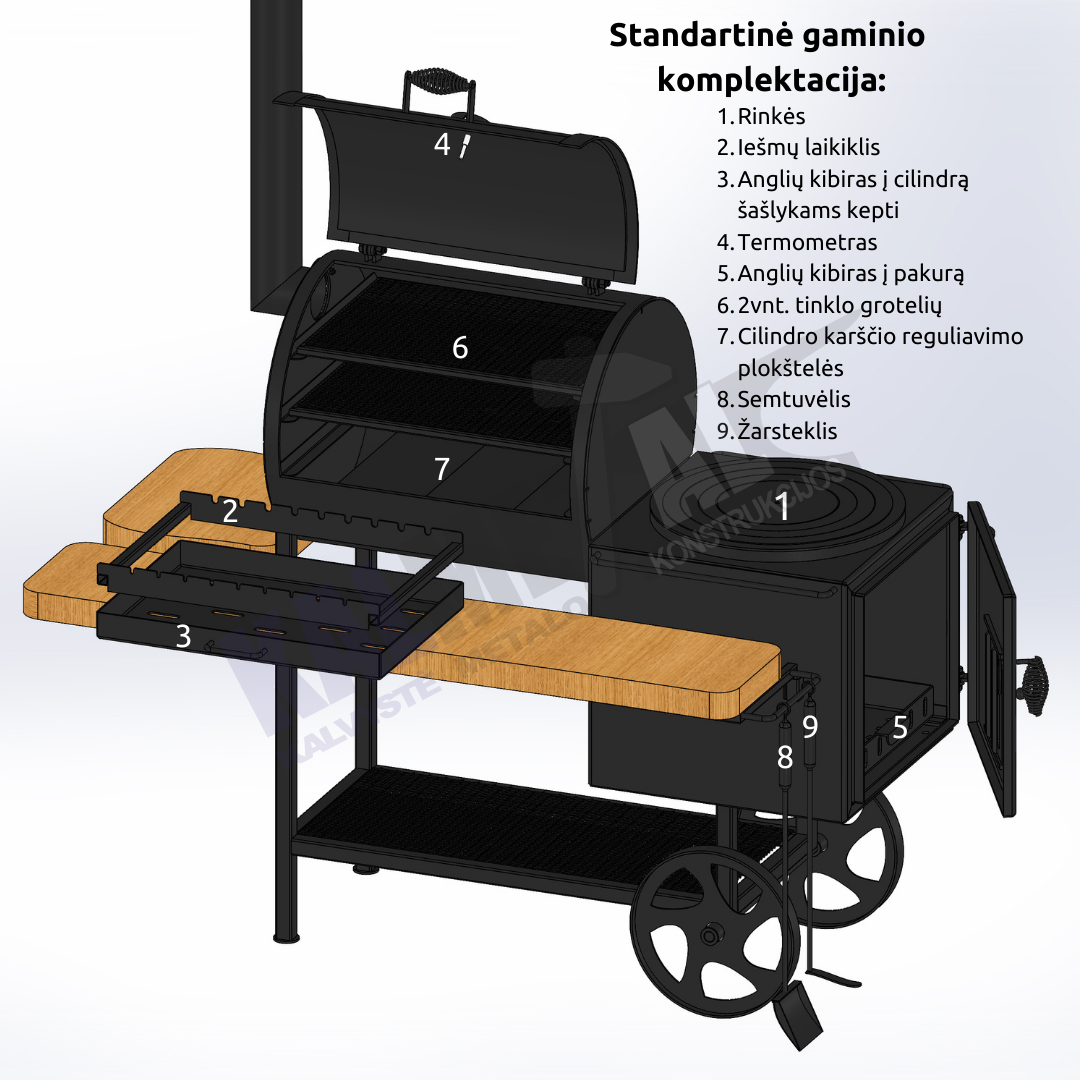 Klientų pamėgta TOP prekė. Tai aukštos kokybės gaminys, rūkyklos kamera pagaminta iš 6,3 mm plieno, pakūra iš 4mm plieno. Tai rūkykla – šašlykinė (kepsninė) – viryklė viename gaminyje. Jei turite mažai vietos ir svajojate apie visus galimus maisto apdorojimo būdus jūsų kieme, ši rūkykla idealus pasirinkimas. Jūs lengvai galėsite ne tik išsikepti šašlykus, išsivirti ryžius, sriubą ar skanų plovą, bet ir išsirūkyti žuvį, mėgstamas daržoves, kalakutą, kiaulieną ar kitą jums patinkantį patiekalą. Iešmams skirtas laikiklis turi įpjovas. Įstatyti iešmai lengvai sukasi 360° kampu, maistas gerai iškepa. Šašlykinė turi nuimamas lakuotas ąžuolines medines lentynas. Gaminys yra nusmėliuojamas, padengiamas grunto sluoksniu ir tik tada dažomas karščiui atspariais dažais. Minimaliai išardomas gaminys. Nusiima kaminas ir medinės lentynos. Rūkykla skirta visoms oro sąlygoms, nepriklausomai nuo metų laiko, kaip žiemą, taip ir vasarą.