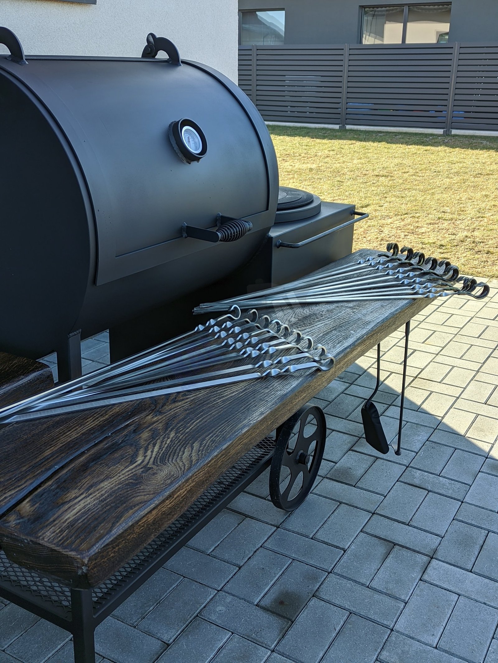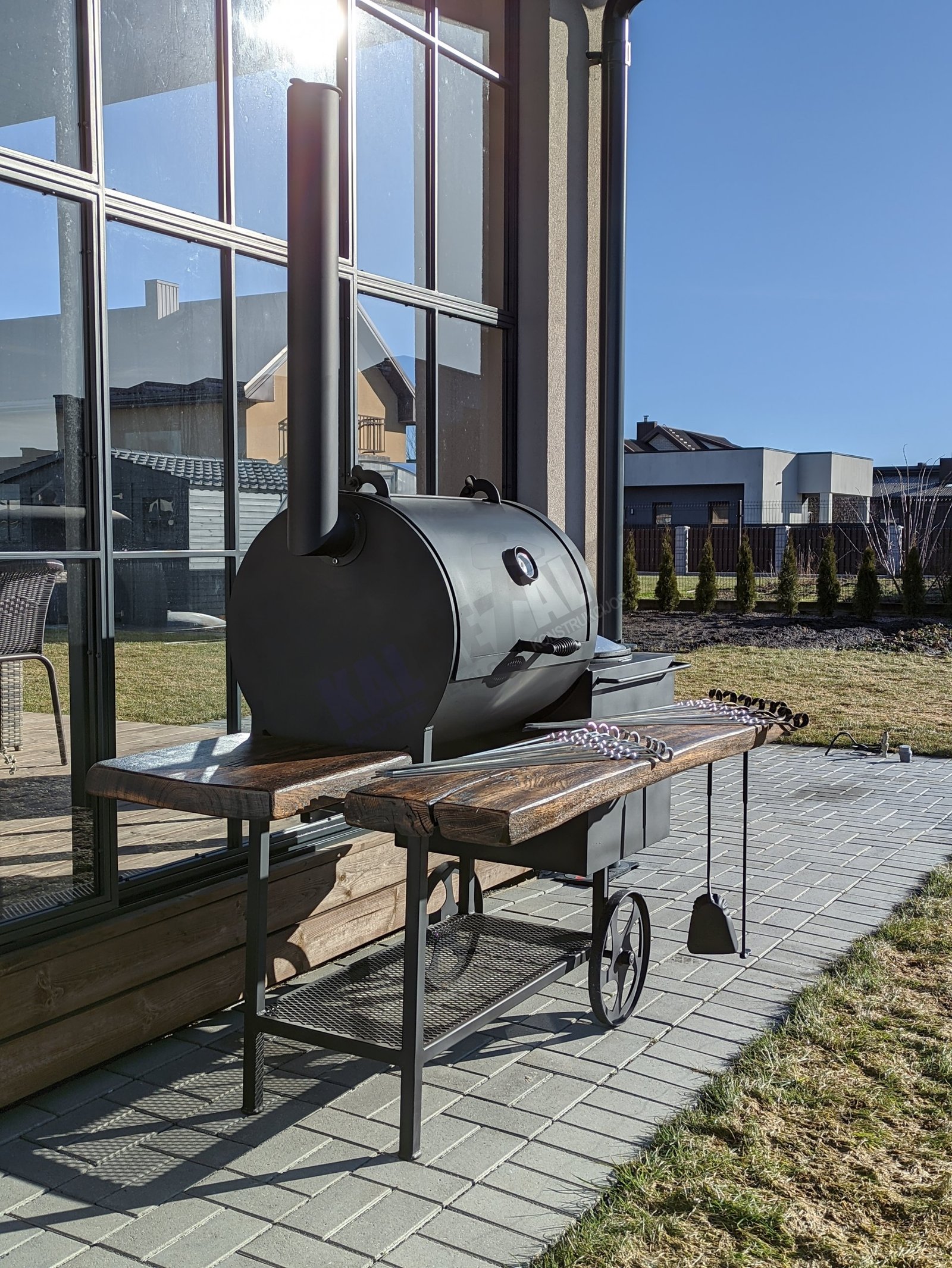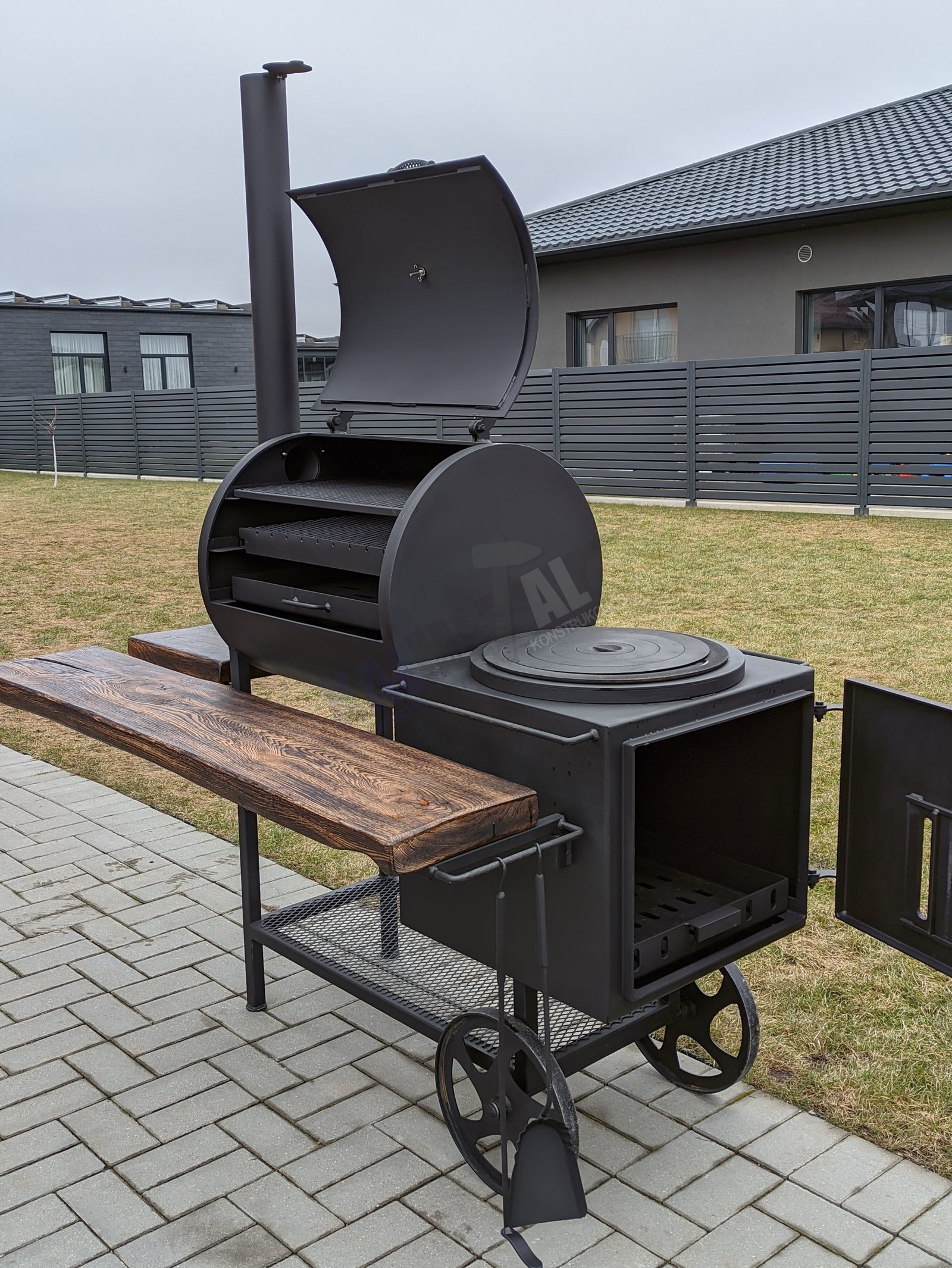 Klientų pamėgta TOP prekė. Tai aukštos kokybės gaminys, rūkyklos kamera pagaminta iš 6,3 mm plieno, pakūra iš 4mm plieno. Tai rūkykla – šašlykinė (kepsninė) – viryklė viename gaminyje. Jei turite mažai vietos ir svajojate apie visus galimus maisto apdorojimo būdus jūsų kieme, ši rūkykla idealus pasirinkimas. Jūs lengvai galėsite ne tik išsikepti šašlykus, išsivirti ryžius, sriubą ar skanų plovą, bet ir išsirūkyti žuvį, mėgstamas daržoves, kalakutą, kiaulieną ar kitą jums patinkantį patiekalą. Iešmams skirtas laikiklis turi įpjovas. Įstatyti iešmai lengvai sukasi 360° kampu, maistas gerai iškepa. Šašlykinė turi nuimamas lakuotas ąžuolines medines lentynas. Gaminys yra nusmėliuojamas, padengiamas grunto sluoksniu ir tik tada dažomas karščiui atspariais dažais. Minimaliai išardomas gaminys. Nusiima kaminas ir medinės lentynos. Rūkykla skirta visoms oro sąlygoms, nepriklausomai nuo metų laiko, kaip žiemą, taip ir vasarą.