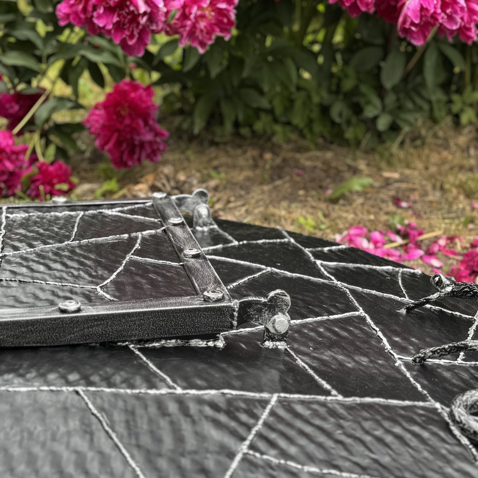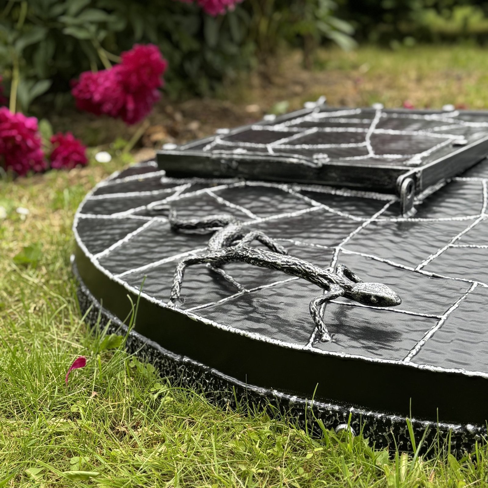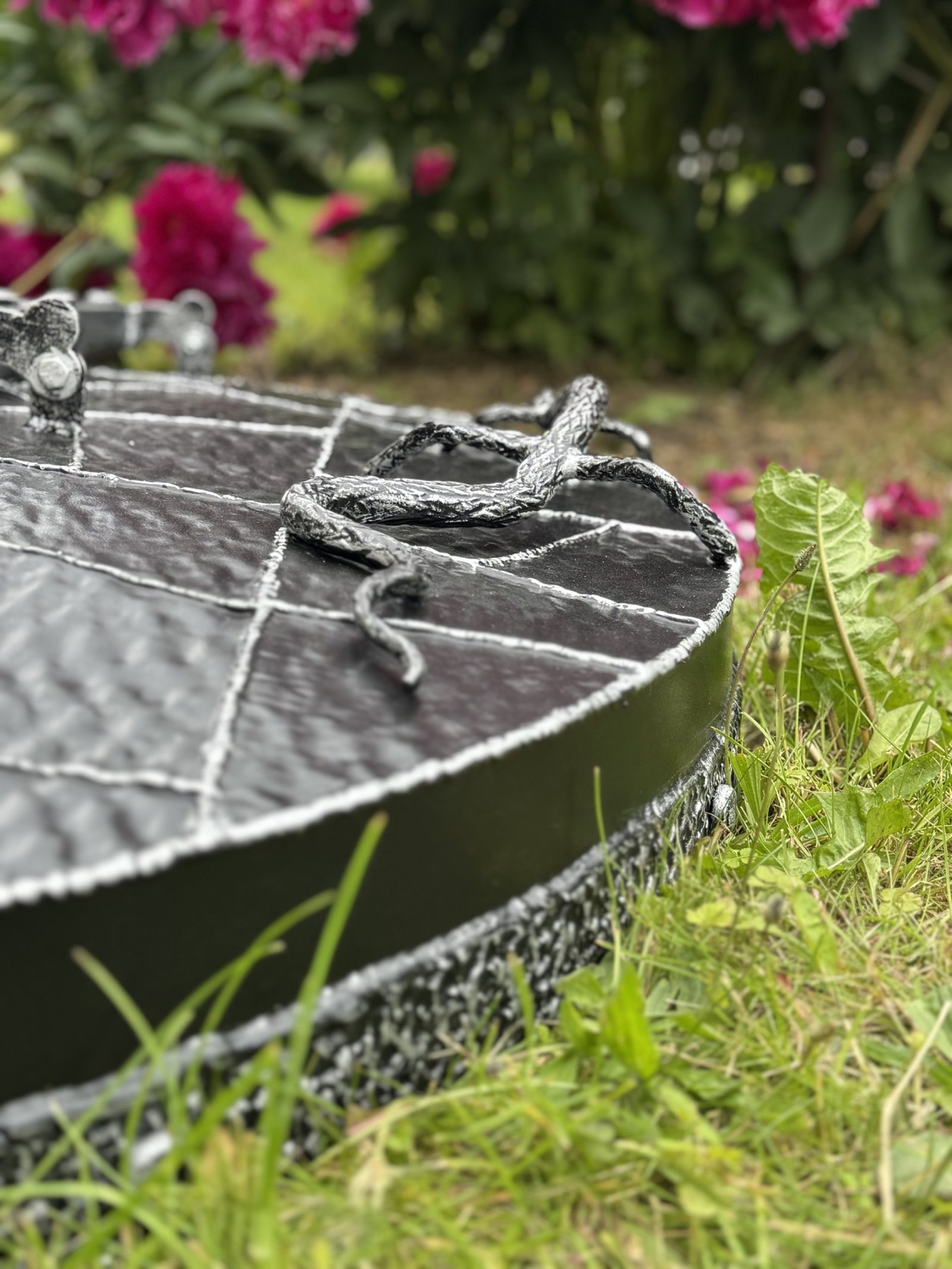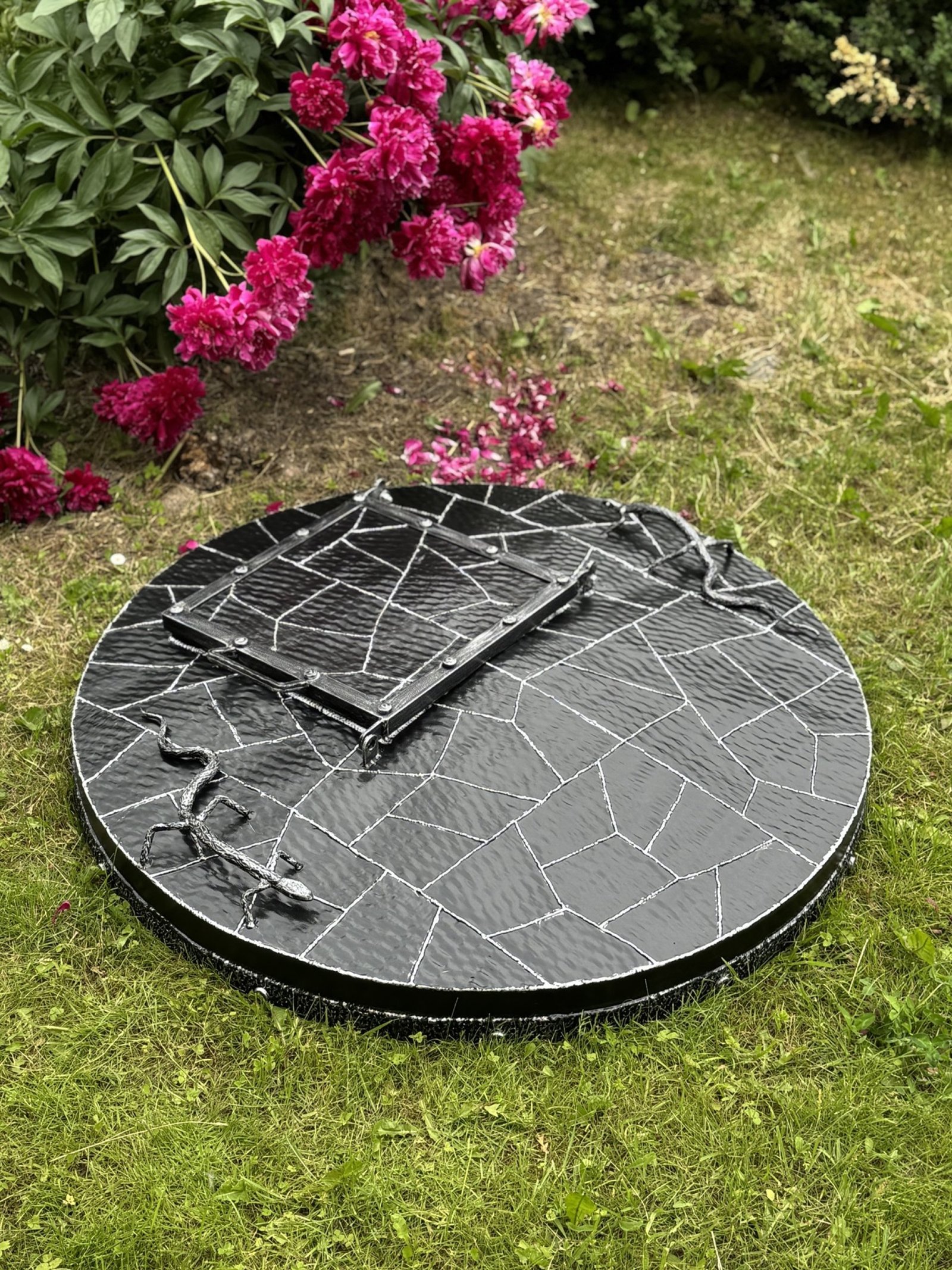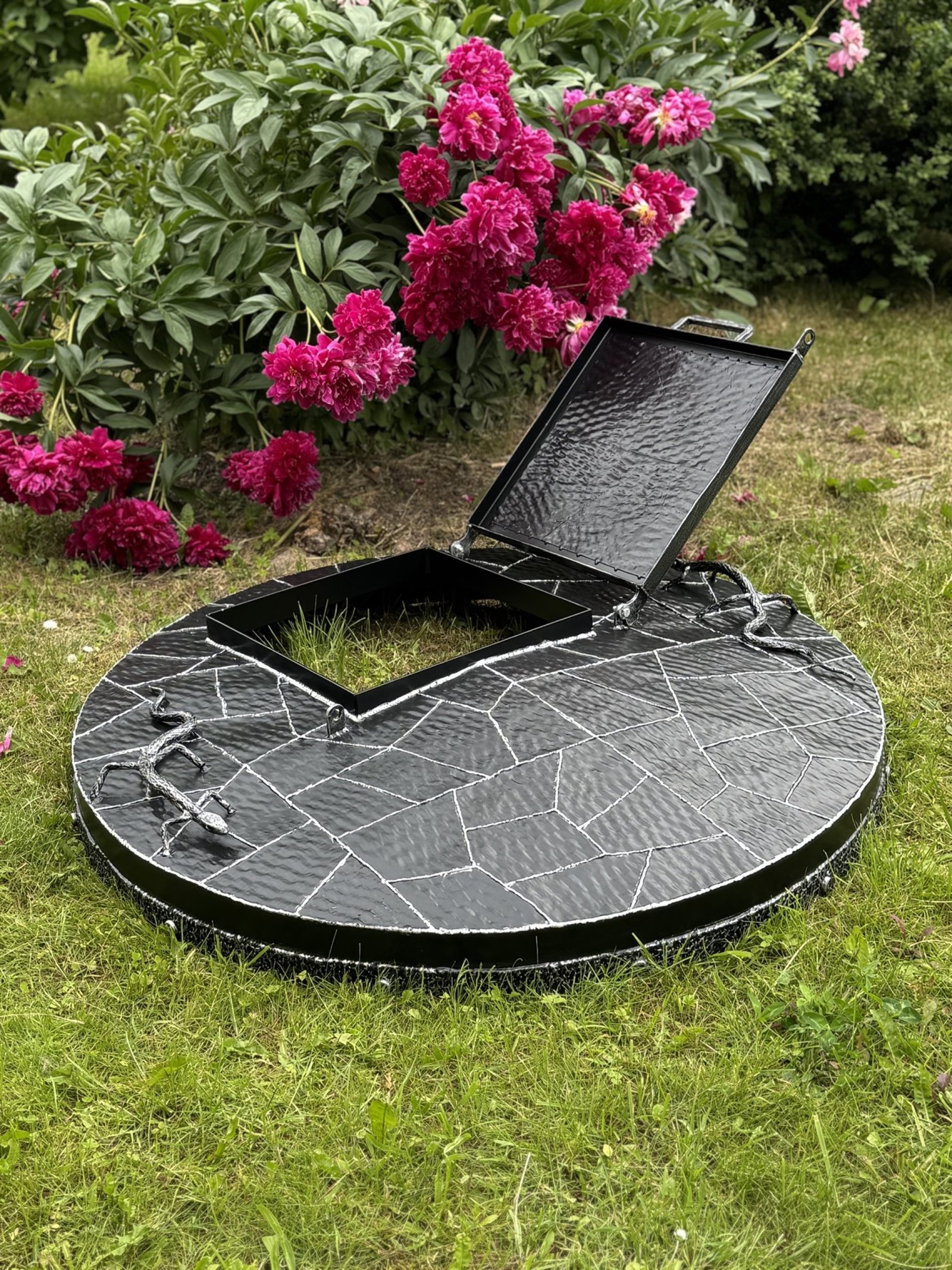 Išskirtinis kalviškas šulinio dangtis su durelėmis ir driežiukais ne tik apsaugos Jūsų šulinį bei užtikrins saugią prieigą prie jo, bet ir papuoš aplinką.
