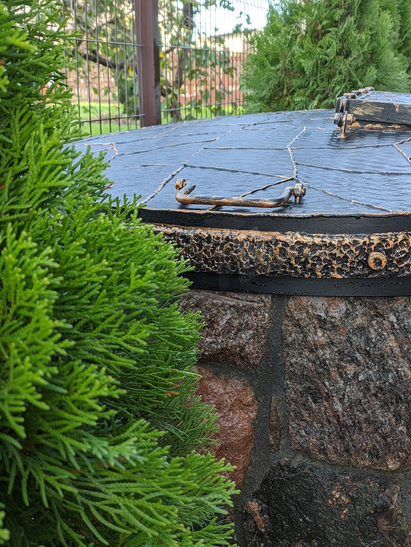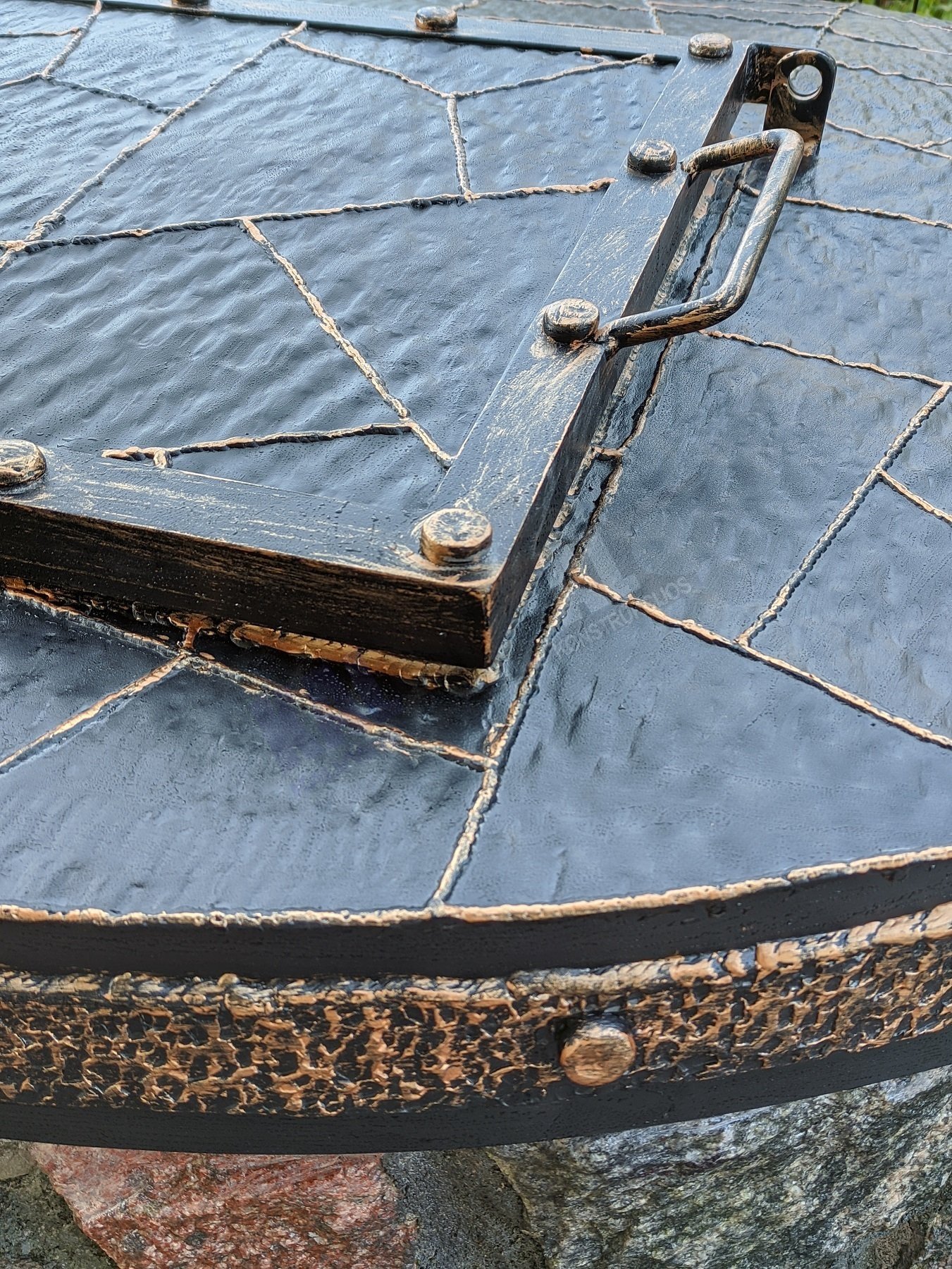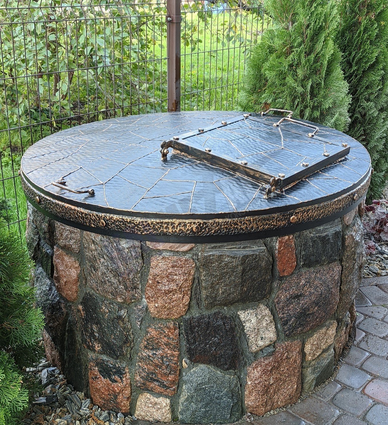 Išskirtinis kalviškas šulinio dangtis su durelėmis ir nulenkiamomis rankenomis